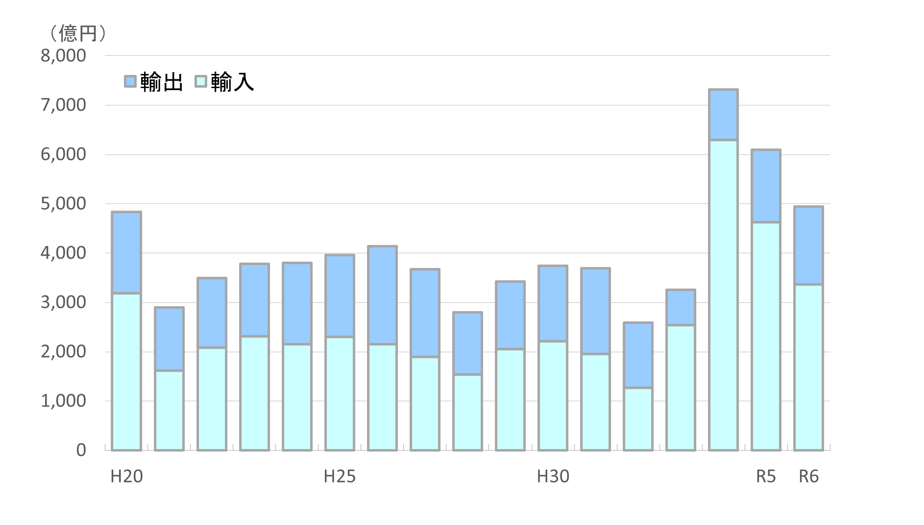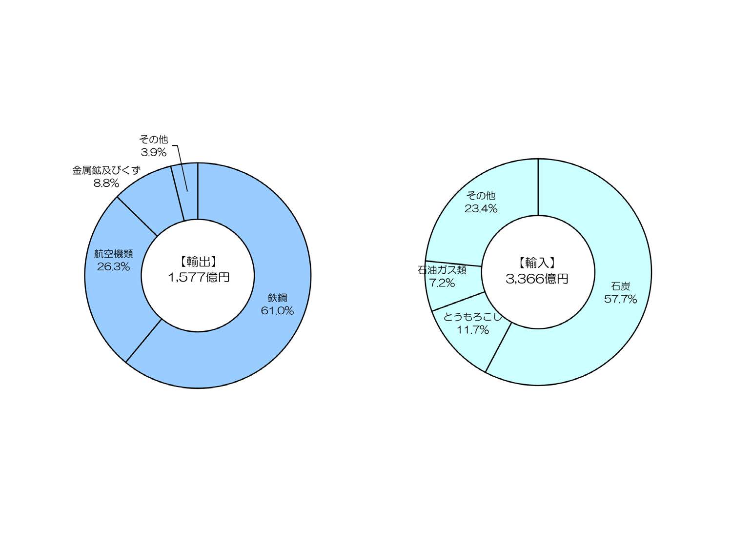 令和6年の貿易額は4,943億円であり、輸入品では石炭、とうもろこし、石油ガス類が上位を占めています。輸出品では鉄鋼、航空種類、金属鉱及びくずが上位を占めています。