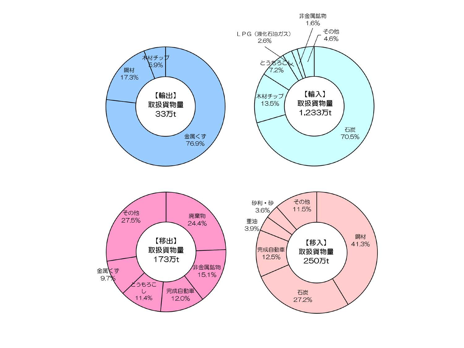 令和6年の取扱貨物量は1,689万トンであり、主に輸入で石炭、木材チップなどを多く取り扱っています。
